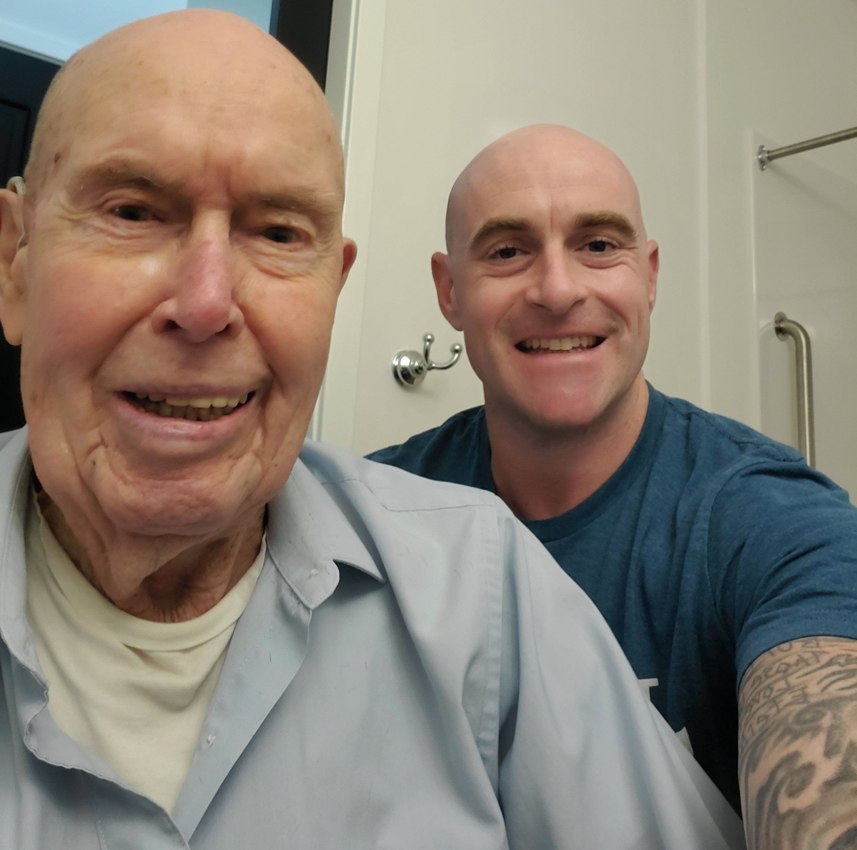 After a slight snicker, he asked if we could take a picture of him and me on his phone. I knelt down next to his wheelchair and snapped a shot. Immediately after the picture, I showed him how it turned out. We shared the same awkward “McCawley-style” smile that didn’t look like a smile at all. In fact, we both had the same smile, opening our mouths like chimpanzees and showing our teeth. We never developed the trait of being photogenic and having the quintessential angle at the side of our mouth that created dimples. However, one could see that we were happy and having a good time. In fact, it looked like two guys who were having a night on the town in our teens. My grandpa even remarked, “It looks like we’re about to go raise some hell on a Friday night.” One can’t help but laugh after hearing a remark like that immediately after taking a selfie with a one-hundred-and-two-year-old man.